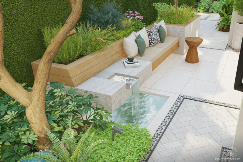 The backyard garden is the most frequently used area, thanks to its direct access from inside the home. A long built-in bench allows for extra cushions, creating a relaxing spot to unwind after a busy day. The sound of a nearby water feature adds to the calm and comfort, making it a perfect retreat within reach.