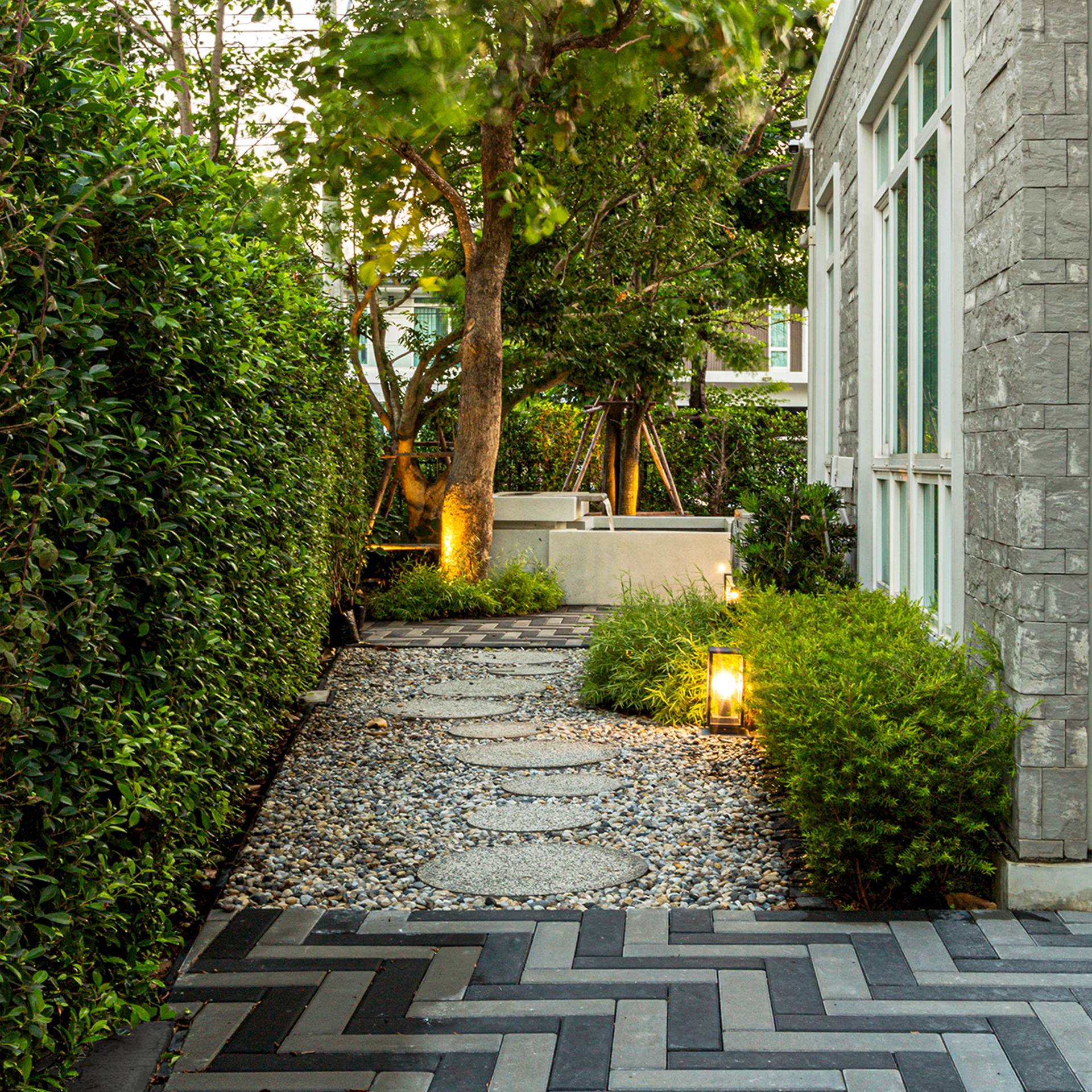 ด้านข้างทางเดิน จัดวางแผ่นทางเดินทรงกลมสลับกับพื้นที๋โรยกรวดให้เชื่อมต่อไปยังพื้นที่หลังบ้านได้ ด้วยความที่บ้านหลังนี้เลี้ยงแมวไว้ ในพื้นที่สวนจึงมีการแทรกต้นไผ่เงิน กับกลุ่มไม้พุ่มตกแต่ง มีประโยชน์ต่อสุขภาพของแมว โดยช่วยในการขับก้อนขนในทางเดินอาหารได้