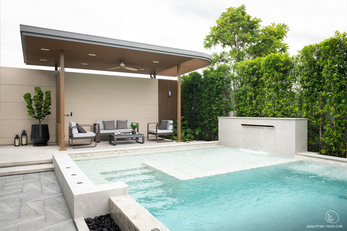 ถัดมาเป็นพื้นที่สระว่ายน้ำแบ่งออกเป็น 3 โซนหลัก ได้แก่ สระผู้ใหญ่ สระเด็ก และมุม Jacuzzi สำหรับนั่งแช่น้ำผ่อนคลายในวันสบาย ๆ ทางทีมเลือกใช้วัสดุเป็นกระเบื้องลายหินสีครีมขนาด 10×10 เซนติเมตร เพื่อให้ภาพรวมดูสว่างและเมื่อน้ำในสระสะท้อนแสงแดดจะระยิบระยับเป็นสีฟ้าใส อีกทั้งยังเลือกใช้เส้นโค้งลบมุม (fillet) สำหรับขอบสระและกระบะต้นเสม็ดแดงฟอร์มสวย เพื่อเพิ่มมิติและความลื่นไหลต่อเนื่องกับขอบอาคาร รวมถึงติดตั้งกำแพงน้ำตกในสไตล์โมเดิร์น เพื่อเพิ่มเสียงน้ำไหลเบา ๆ ทำให้บรรยากาศในสวนรู้สึกผ่อนคลายและสดชื่นมากยิ่งขึ้น
